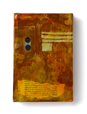 When I spilled the waxed paper bags out of the folder, along followed an old book of poetry which disintegrated as it fell. The pages leapt out of the book and onto the waxed paper bags . Gluing scraps down and smearing WhiteOut over the words began the process of composing. I began looking closely at the words, which were not covered, realizing fresh cryptic poems were writing themselves. I simply helped them along adding marks with ball point pens from the hotel room (sharpies wouldn't write over the wax) and stamped words of my choosing. I carried them in a cigar box back home to the studio. They were first shown at Gem Gallery on Peaks Island.......In their ephemera state, viewers saw them more as cards than paintings. So, I adhered each piece to a birch panel with resin and wax and painted a few translucent layers of oil paint. The result is what you see here. There are 22 total pieces in the series which equals one whole Foods paper bag. Pretty nice huh?